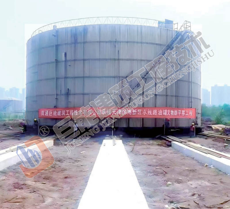 该项目位于天津市滨海新区水线路。油罐平移工程共三座,每座油罐直径约24米,高约7米,容量约5000立方米,重约250吨,因业主二次规划要求,将三座油罐各平移约90米。完成时间2025年8月,历时60天。