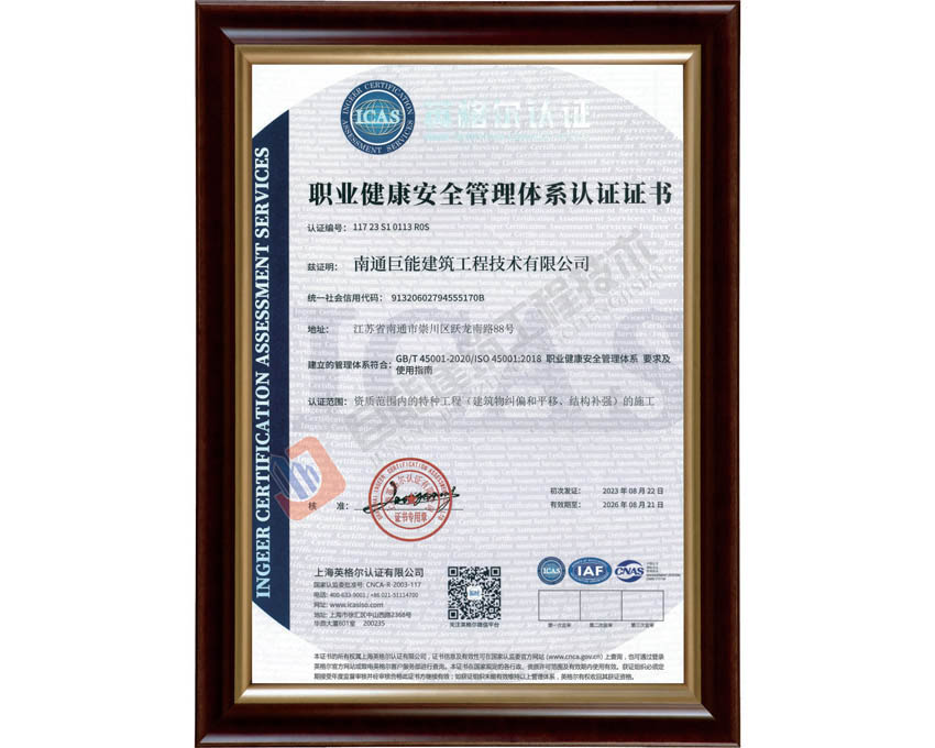 职业健康安全管理体系认证证书